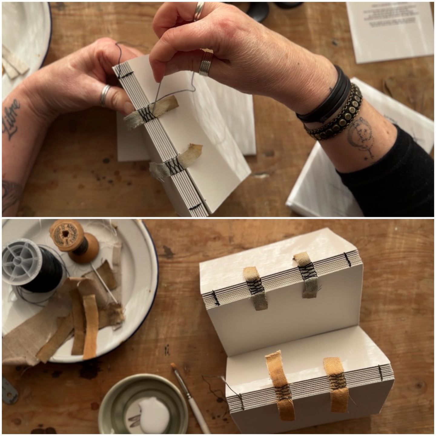 Deretter syr vi en rå journal for hånd. En bok der tråd, papir og stoff får være en del av uttrykket.